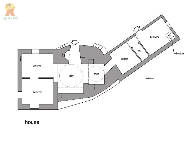 Descrizione:l'immobile comprende due trulli centrali e due lamie situate ai lati dei trulli. Nei trulli è stato realizzato il soggiorno, nella prima lamia troviamo la cucina, il bagno e una camera con camino, nella seconda lamia ci sono due camere, di cui una di passaggio.